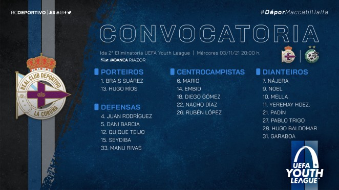 ABANCA-RIAZOR prepárase para vivir outra noite europea mañá mércores 3 de novembro (20:00 horas) coa visita do Maccabi Haifa de Israel no partido de ida da segunda eliminatoria na Ruta de Campións Nacionais da UEFA Youth League. "Todos os xogadores saben como está a ir a cousa en canto a entradas. Vai haber un gran ambiente e esperamos un gran ambiente. Axudounos a poder facer a remontada (na primeira eliminatoria) e mañá vainos a axudar. Gústame e súmanos máis que réstanos", manifestou Manuel Pablo na rolda de prensa previa desta mañá en Abegondo.
