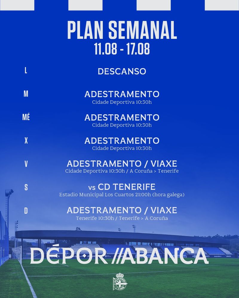A 53 edición da Copa Teide é o partido fixado para esta nova semana de pretemporada para o Dépor ABANCA.O encontro xogarase no Estadio Los Cuartos de La Orotava ante o Costa Adeje Tenerife de Liga F o sábado 16 de agosto ás 21:00 (hora galega, 20:00 hora local).Ainhoa Marín, finalizado o Trofeo Teresa Herrera, mostrouse "moi contenta" coas novas incorporacións: "Todas nos dan un punto de mellora respecto ao ano pasado. Era o que se necesitaba. De verdade que estou ilusionada co que vai vir. Espero que podamos dar moitas alegrías nesta temporada que vén".Fran Alonso dispuxo 4 sesións matinais de adestramento na Cidade Deportiva desde este martes 12 de agosto.A planificación semanal, sempre susceptible de sufrir variación por razóns técnicas, é a seguinte:Luns 11 de agostoDescansoMartes 12 de agosto10:30 h.Mércores 13 de agosto10:30 h.Xoves 14 de agosto10:30 h.Venres 15 de agosto10:30 h.Sábado 16 de agosto21:00 (hora galega, 20:00 hora local): Costa Adeje Tenerife - Deportivo en Los Cuartos de La Orotava