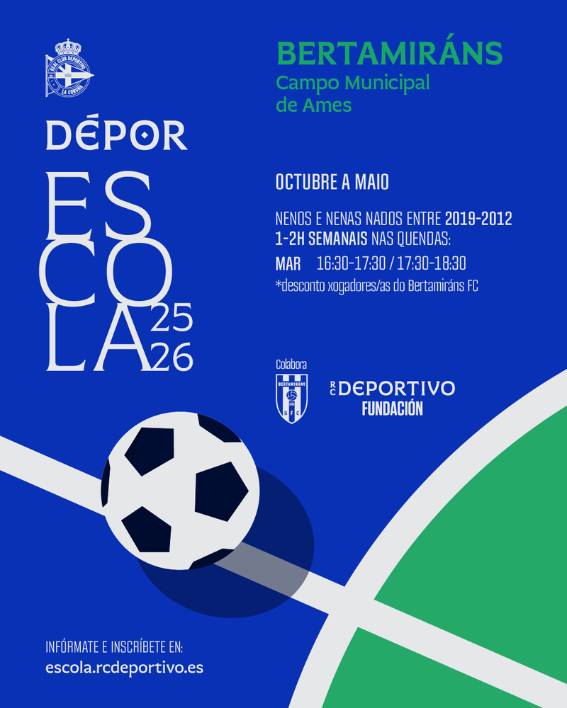 Bertamiráns, referente en cada DéporCampus Cabreiroá de verán, contará desde o vindeiro mércores 1 de outubro tamén cunha sede da Escola RC Deportivo, en colaboración co Bertamiráns FC e o Concello de Ames.Xa está aberto o prazo de inscrición en .Esta escola profesional de fútbol está destinada a todos os nenos e nenas nadas entre 2012 e 2019 incluídos que desexen complementar a súa formación de maneira máis específica con adestradores da canteira do RC Deportivo independentemente do seu nivel de práctica.Nesta sede hai dobre quenda os martes: 16: 30 e 17:30 horas; e os xogadores e xogadoras do Bertamiráns FC terán desconto.Toda a información acerca de tarifas, horarios, que inclúe a actividade, etc... pode consultarse en .Para calquera dúbida ou consulta acerca da actividade así como calquera problema co proceso de inscrición poden contactar coa organización no correo electrónico [email protected].