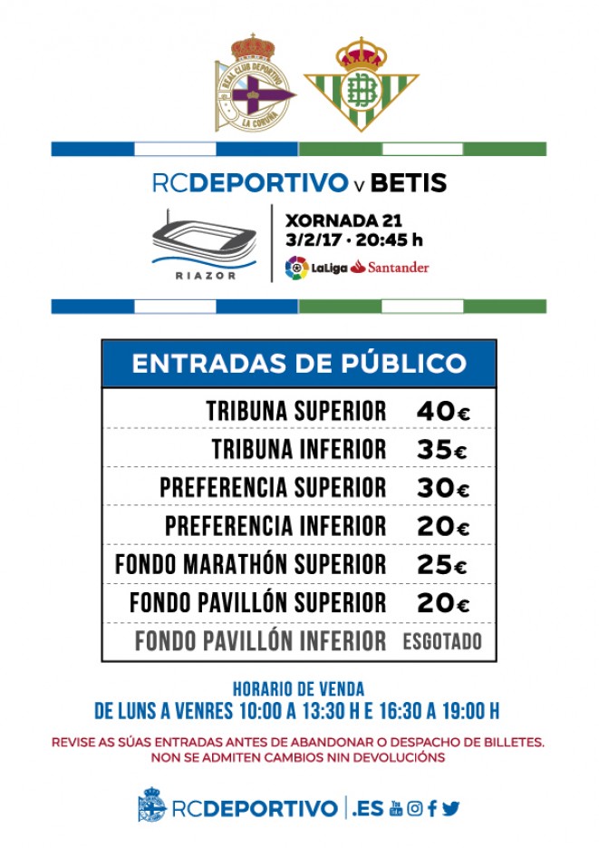 Xa están á venda as entradas para o partido da 21ª xornada de LaLiga en Riazor: Dépor-Betis, que se disputa o venres 3 de febreiro a partir das 20:45 h. Os prezos das entradas oscilan entre os 40 € da Tribuna Superior e os 20 € de Pavillón Superior e Preferencia Inferior. As localidades poden comprarse no horario habitual da Oficina de Atención ao Deportivista: de 10:00 a 13:30 e de 16:30 a 19:00 h. de luns a venres. Os días de partido as entradas están á venda nos despachos de billetes do Pazo dos Deportes de Riazor desde as 11:00 e ata o comezo do choque.