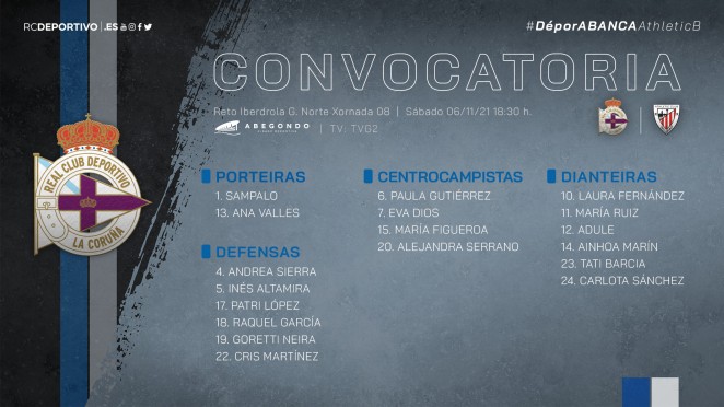 O Deportivo ABANCA recibe mañá sábado 6 de novembro ás 18:30 en Abegondo ao Athletic Club B, retransmitido en directo pola TVG2, nun partido que chega trala primeira e dolorosa derrota da pasada fin de semana no Estadio Mundial 82 ante o DUX Logroño, cun gol das rioxanas no tempo engadido.
