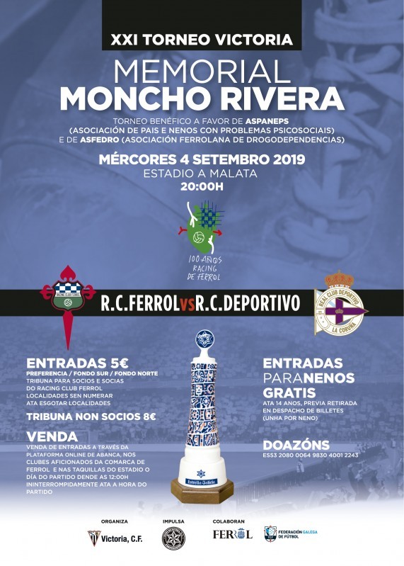 El próximo miércoles 4 de septiembre, a las 20:00 horas, tendrá lugar el Memorial Moncho Rivera con el partido entre el Racing Club de Ferrol y el RC Deportivo en el estadio de A Malata. Se trata de un encuentro benéfico que alcanza ya su vigésimo primera edición y que cada año organiza el Victoria CF con el apoyo de Corporación Hijos de Rivera.