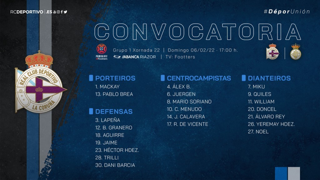 En el Dépor, son bajas obligadas Víctor, Pablo Trigueros y Villares. Entre los 22 futbolistas que integran la convocatoria se encuentran los canteranos Noel, Trilli, Yeremay y Dani Barcia.