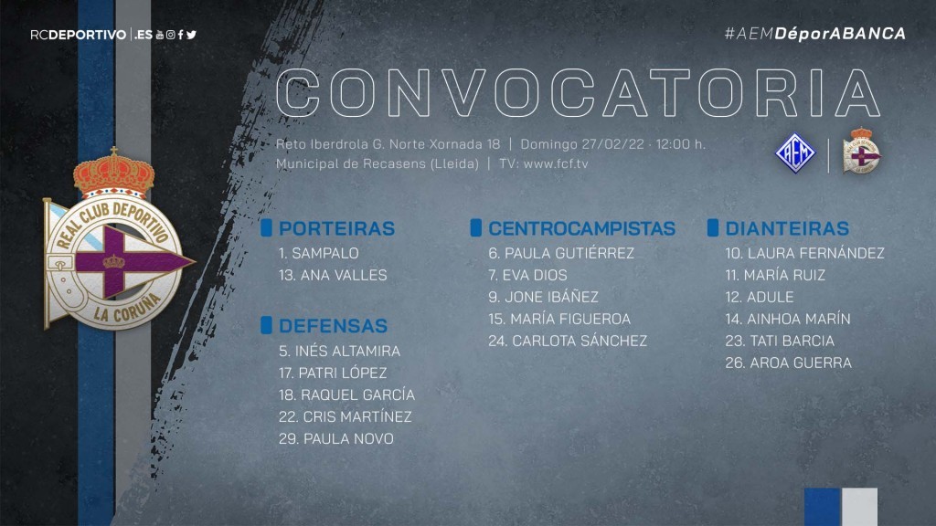 Son baja por lesión Andrea Sierra, Goretti y Alba Merino, que "dentro de poco estará con nosotras", vaticinó sobre la capitana el técnico deportivista en la sala de prensa de Abegondo. Tampoco está entre las convocadas Alejandra Serrano, con permiso.