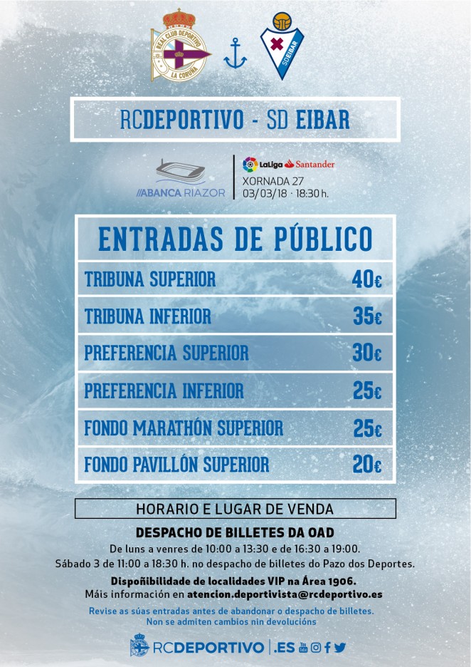 Las taquillas del Palacio de los Deportes de Riazor abrirán a las 11:00 horas del sábado 3 de marzo para poner a la venta las entradas disponibles para el Dépor-Eibar que se disputa a las 18:30 en el Estadio Abanca-Riazor. Hasta ese momento se despacharán entradas.